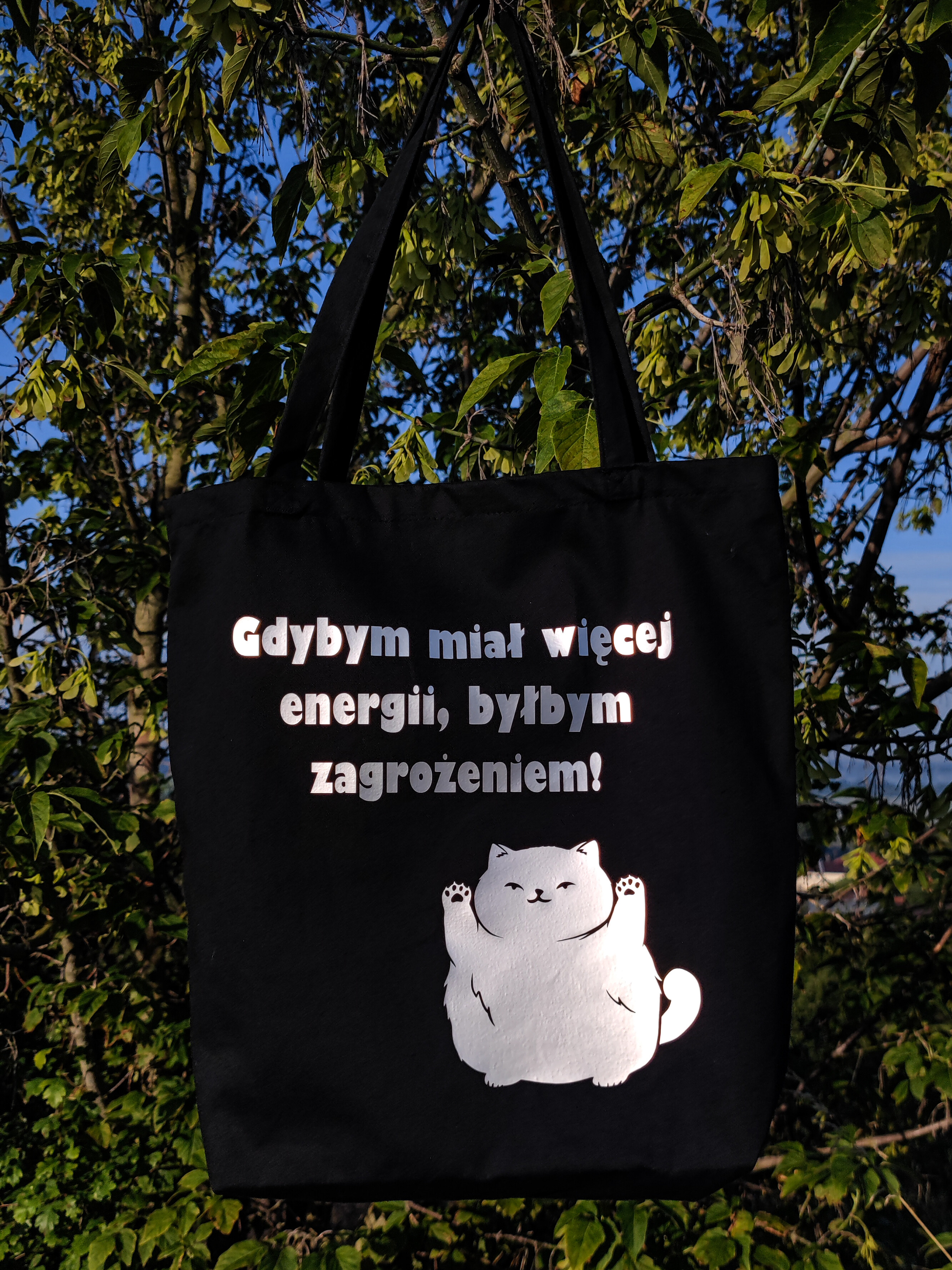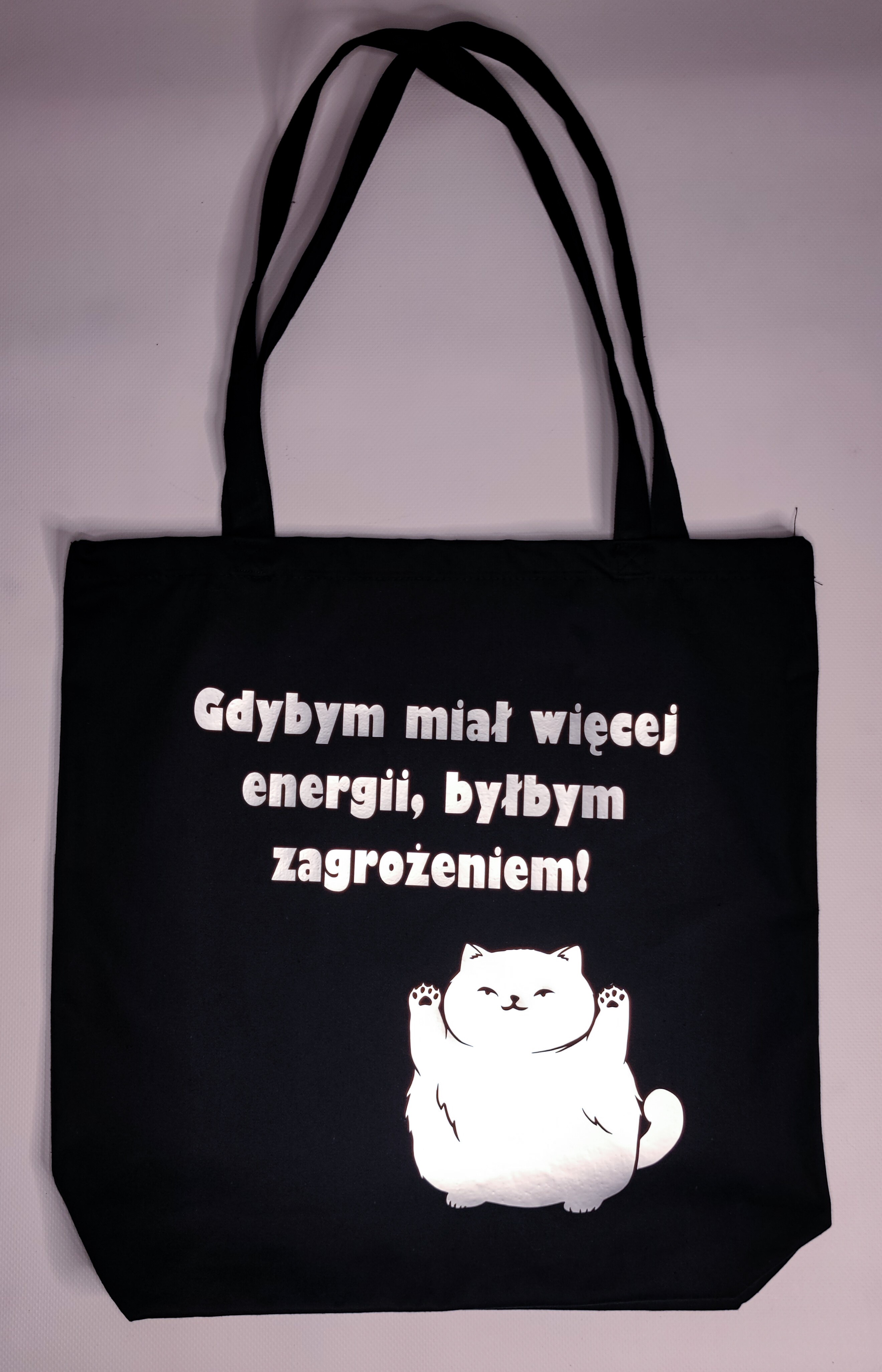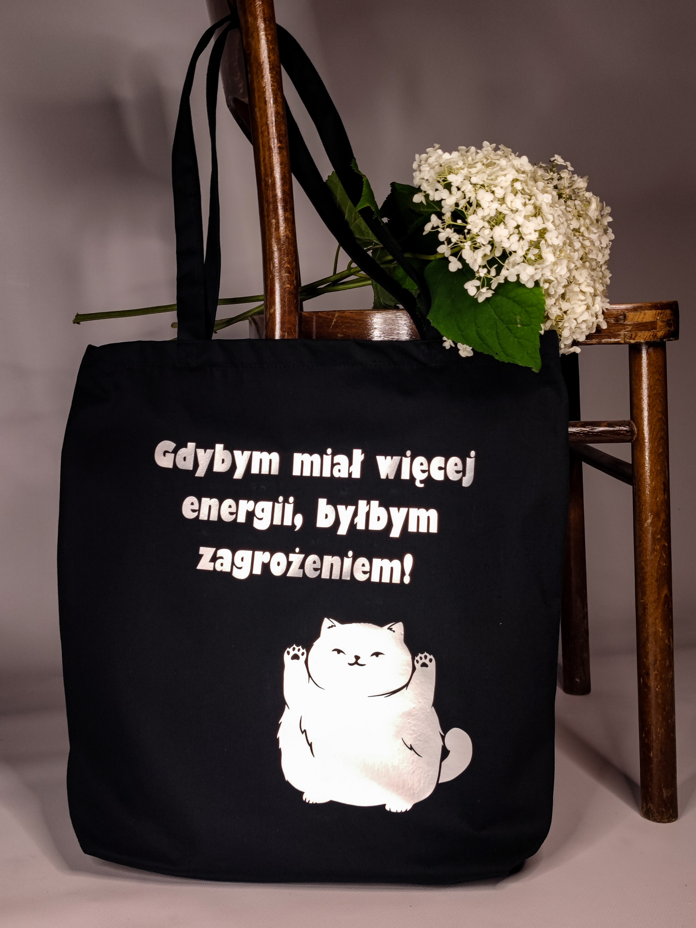 Torba bawełniana z nadrukiem - „Gdybym miał więcej energii, byłbym zagrożeniem!” Wykonana z grubej bawełny (280 g), pojemna torba z dnem i długim uchwytem. Wybierz kolor folii z jakiego wykonany jest napis i wzór.