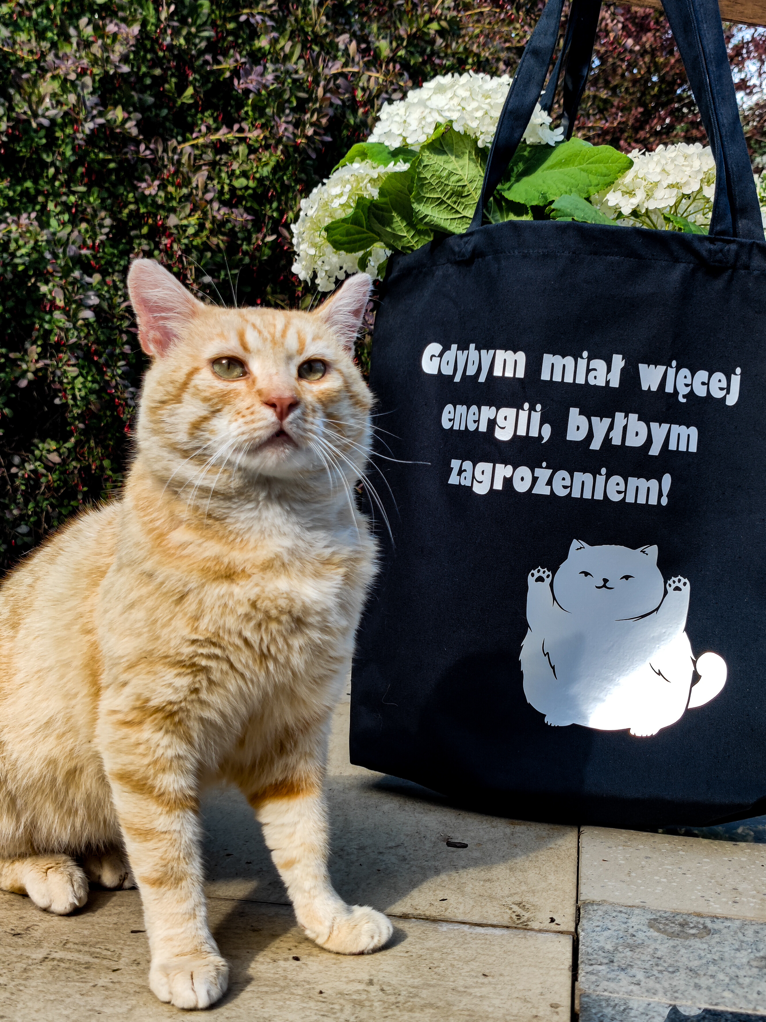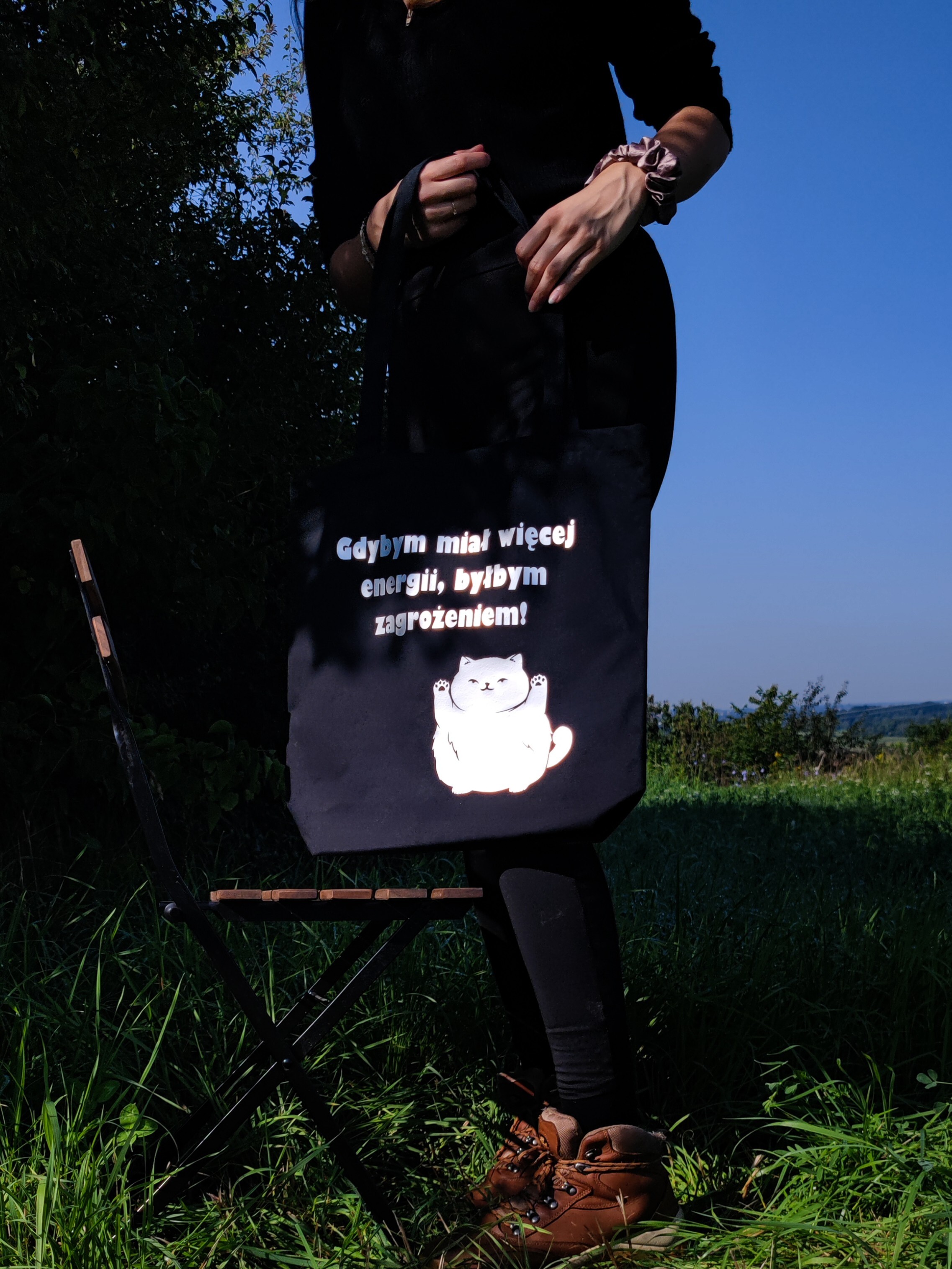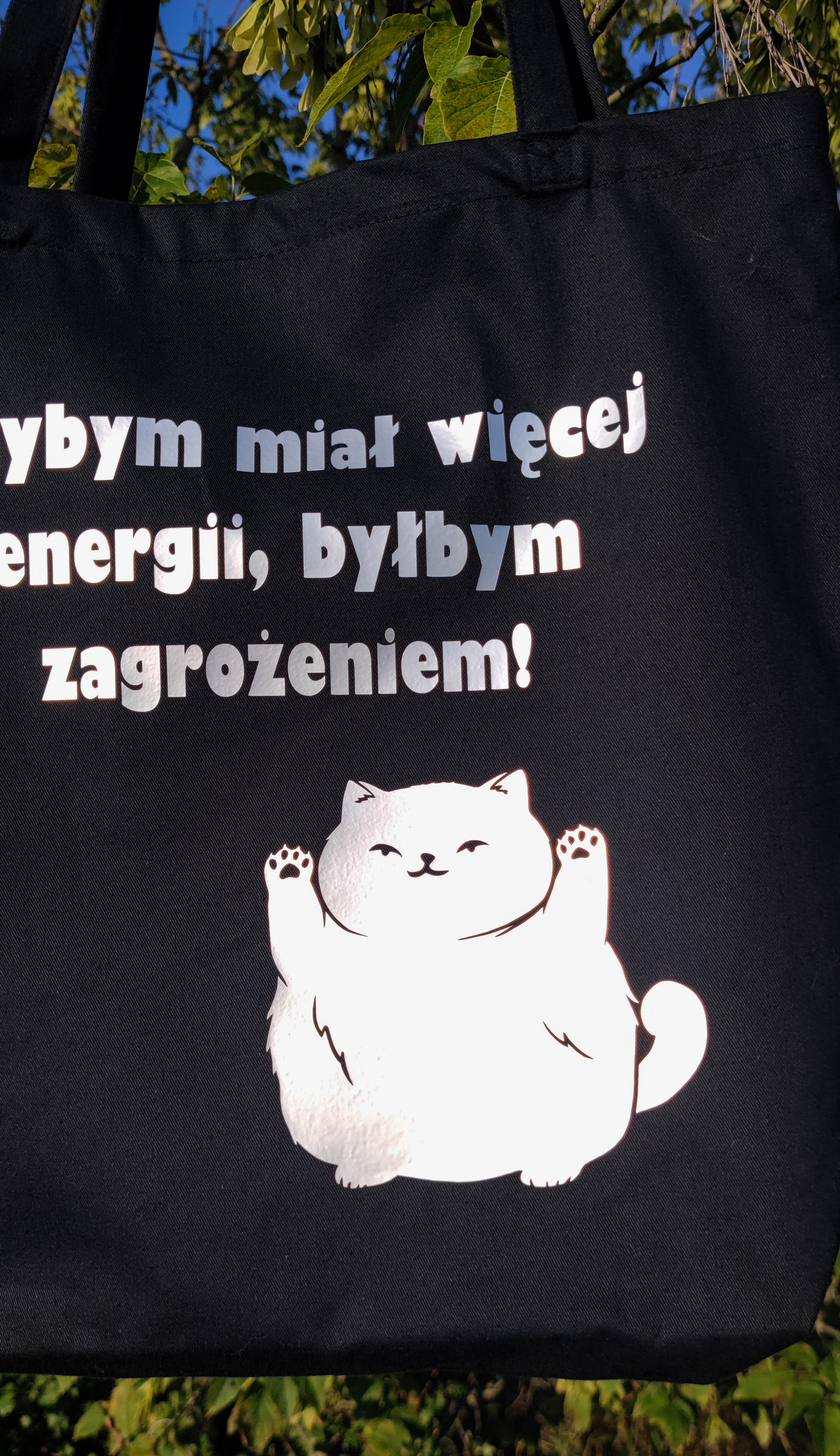 Torba bawełniana z nadrukiem - „Gdybym miał więcej energii, byłbym zagrożeniem!” Wykonana z grubej bawełny (280 g), pojemna torba z dnem i długim uchwytem. Wybierz kolor folii z jakiego wykonany jest napis i wzór.
