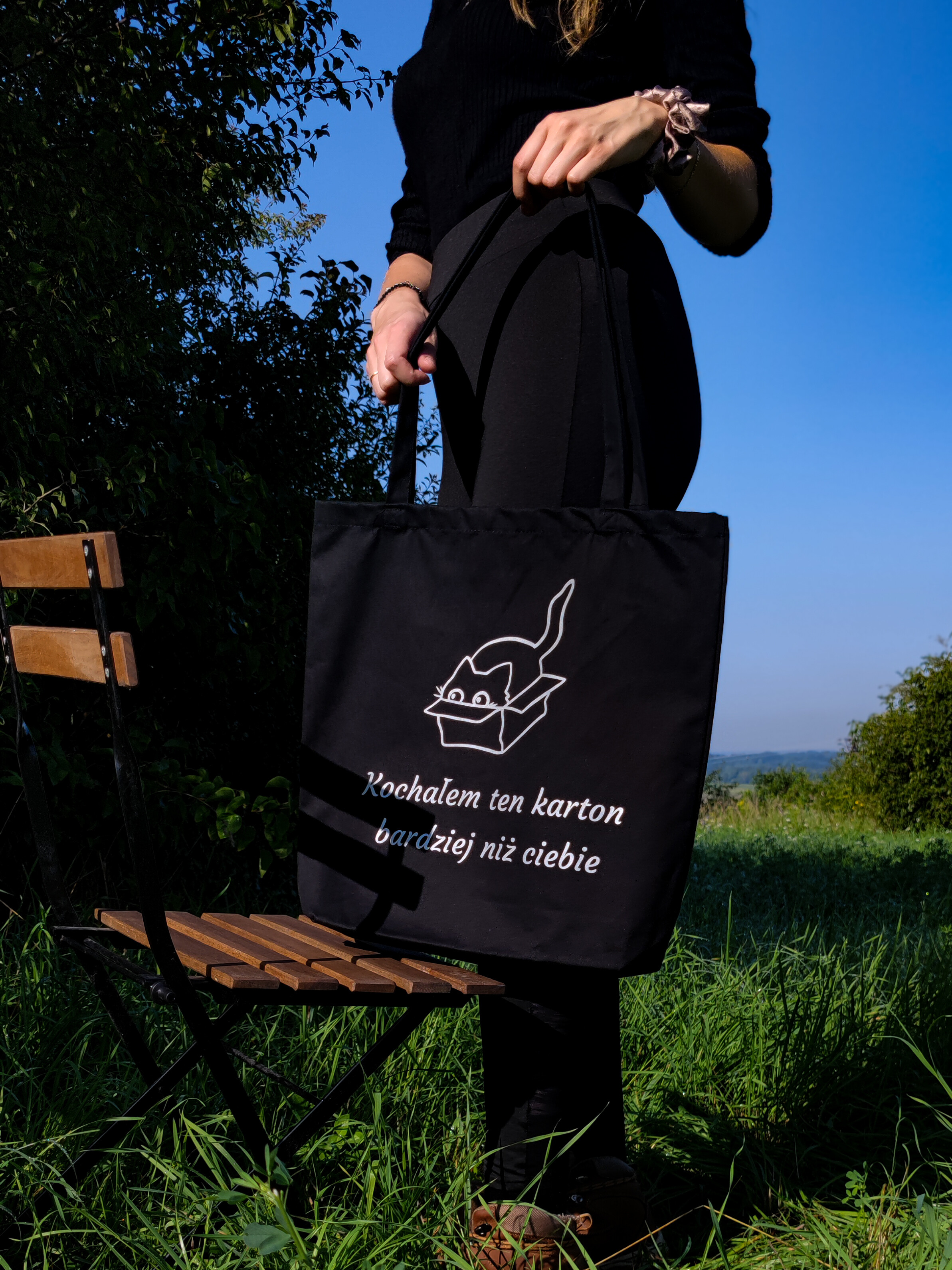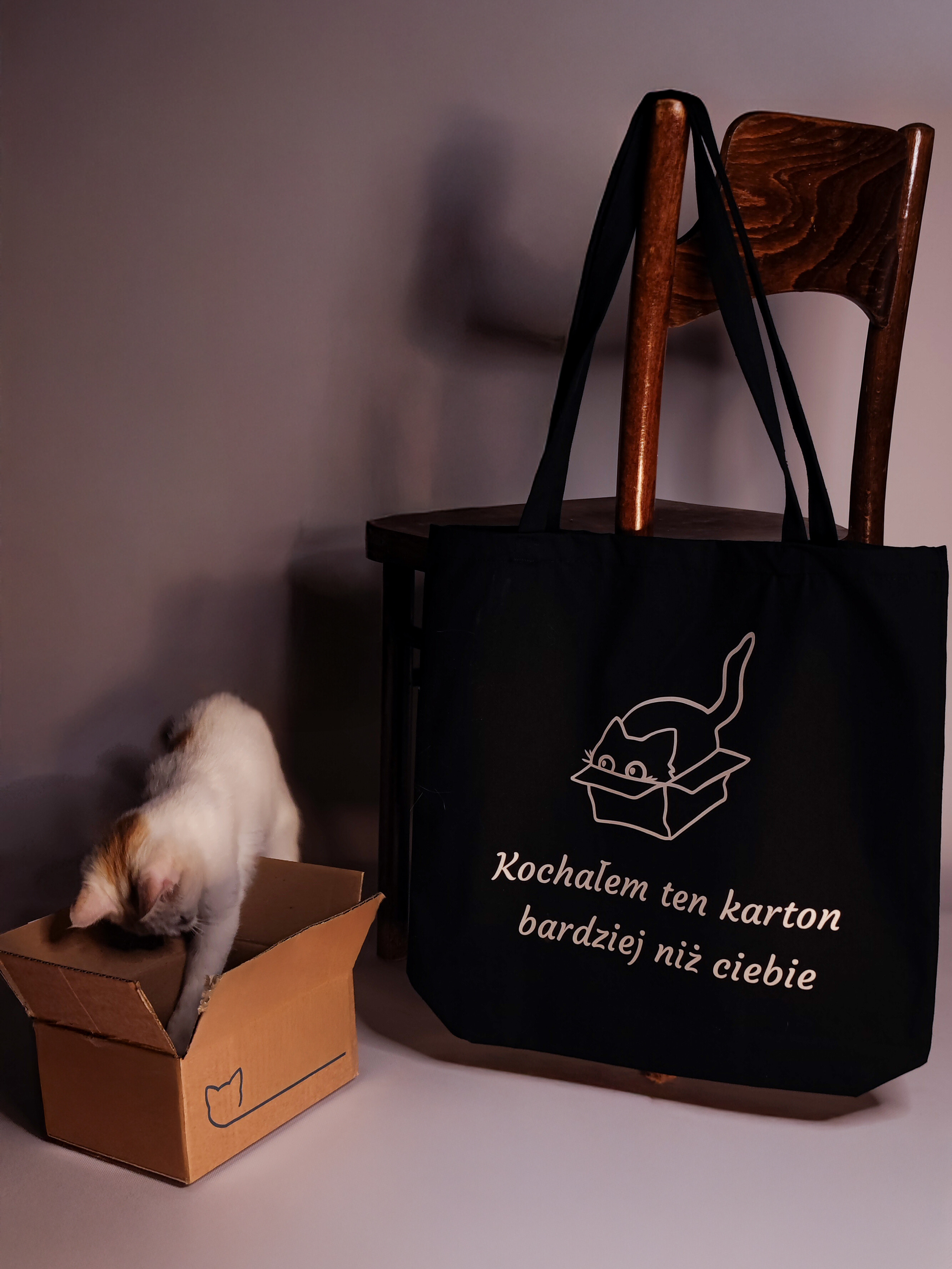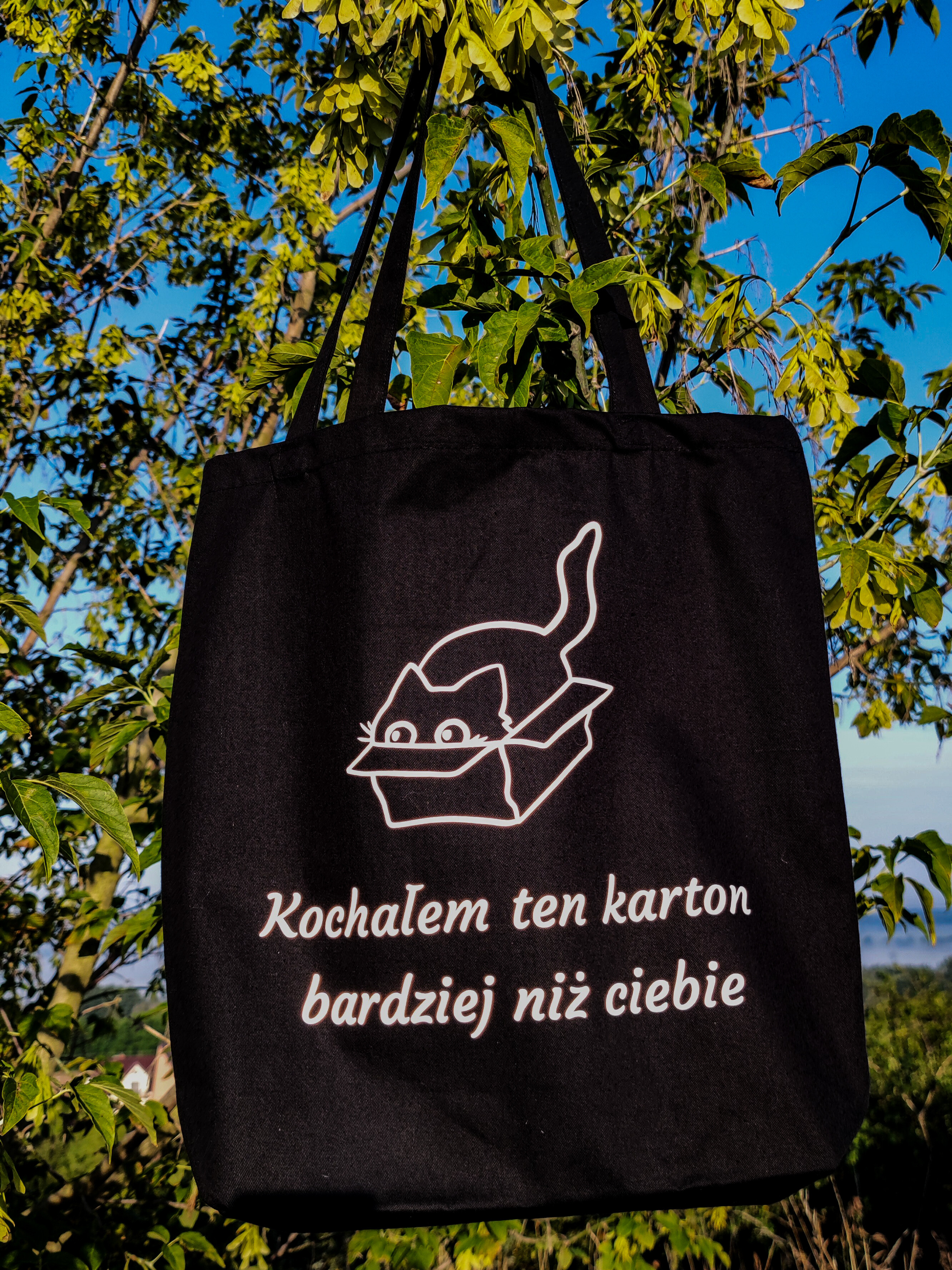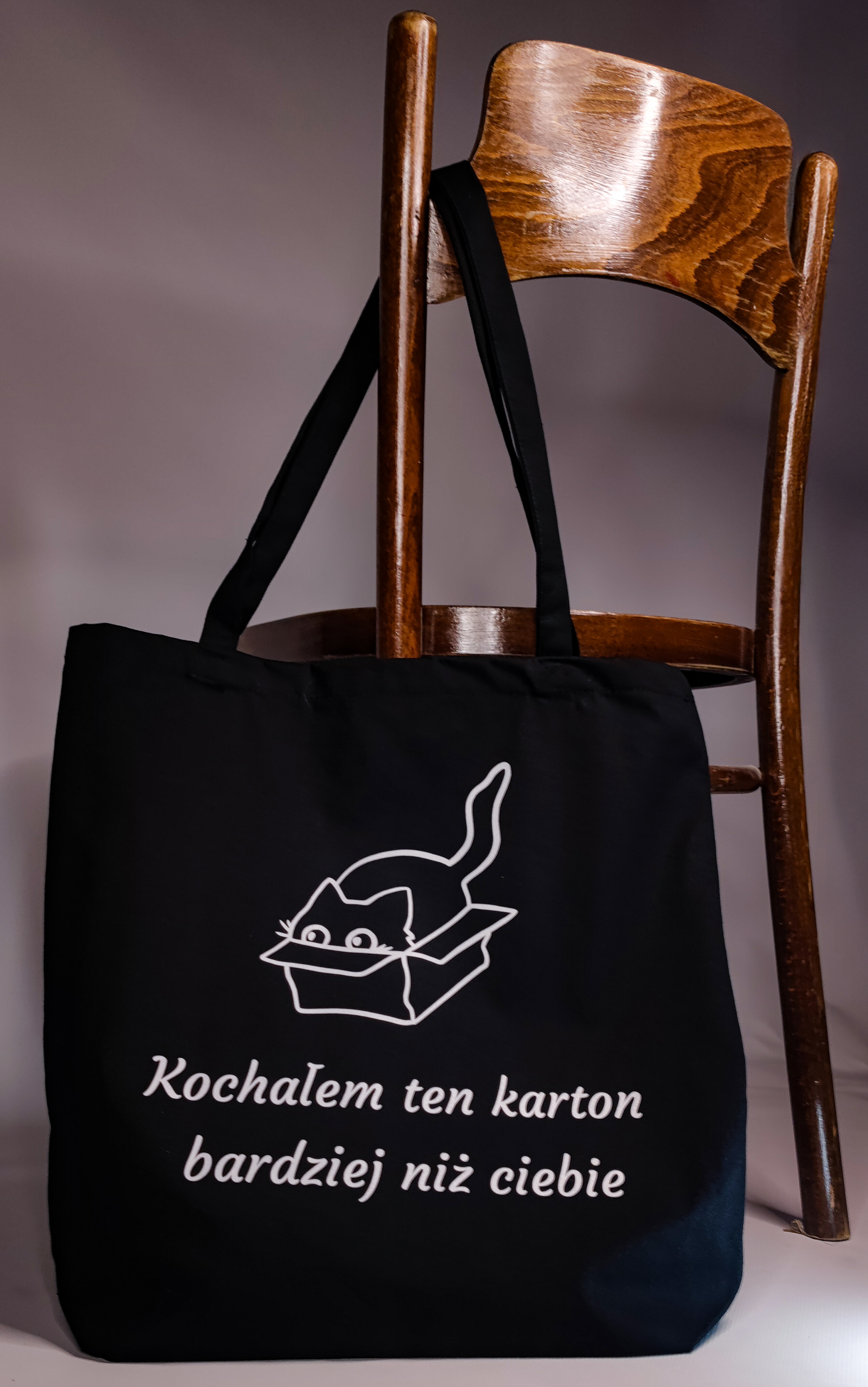 Torba bawełniana z nadrukiem - „Kochałem ten karton bardziej niż ciebie” Wykonana z grubej bawełny (280 g), pojemna torba z dnem i długim uchwytem. Wybierz kolor folii z jakiego wykonany jest napis i wzór.