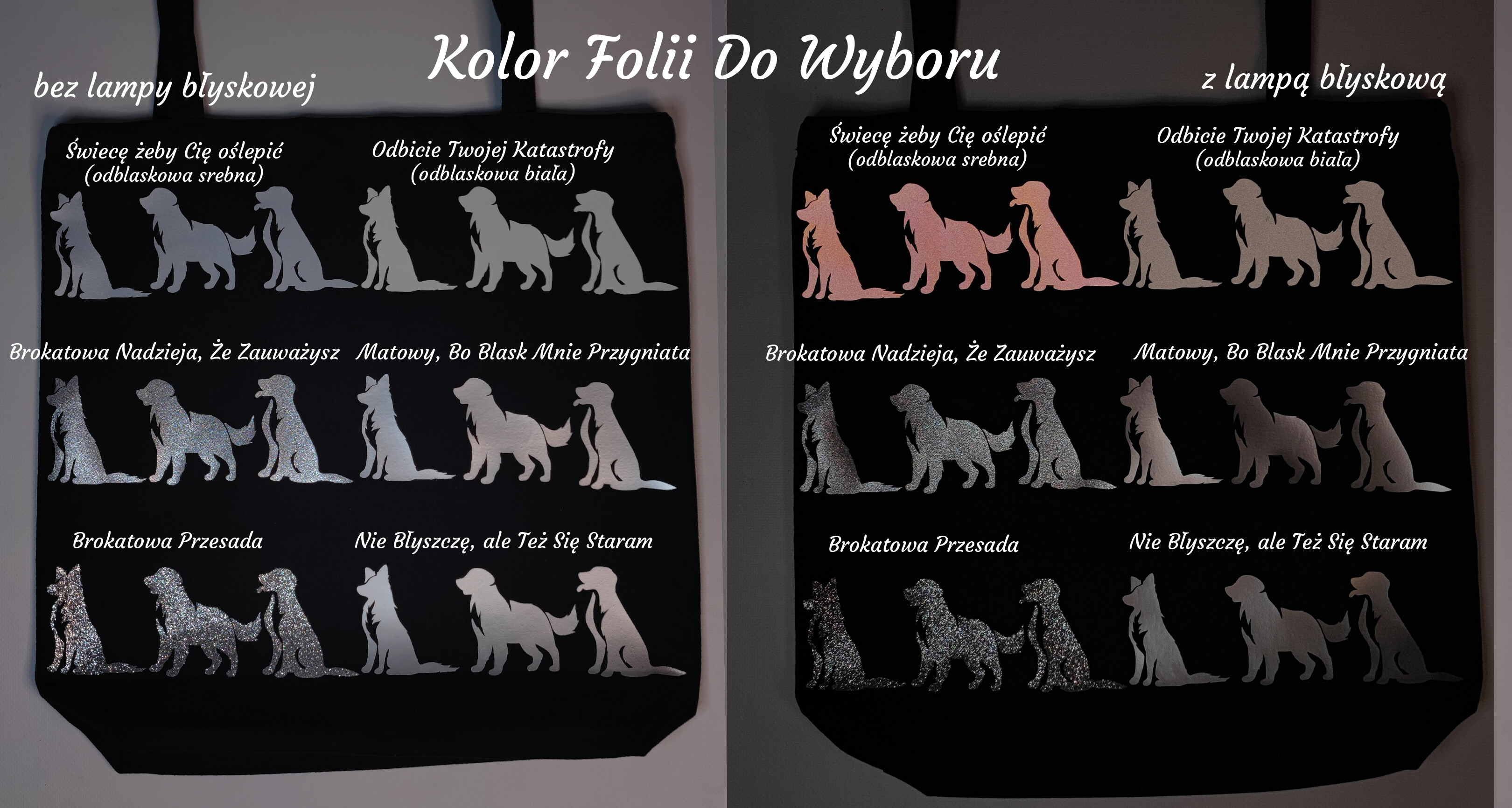 Folia z delikatnymi drobinkami błyszczącymi, które sprawiają, że jest odblaskowa. Powierzchnia subtelnie mieni się w świetle lampy błyskowej lub pod odpowiednim kątem światła odbija je.