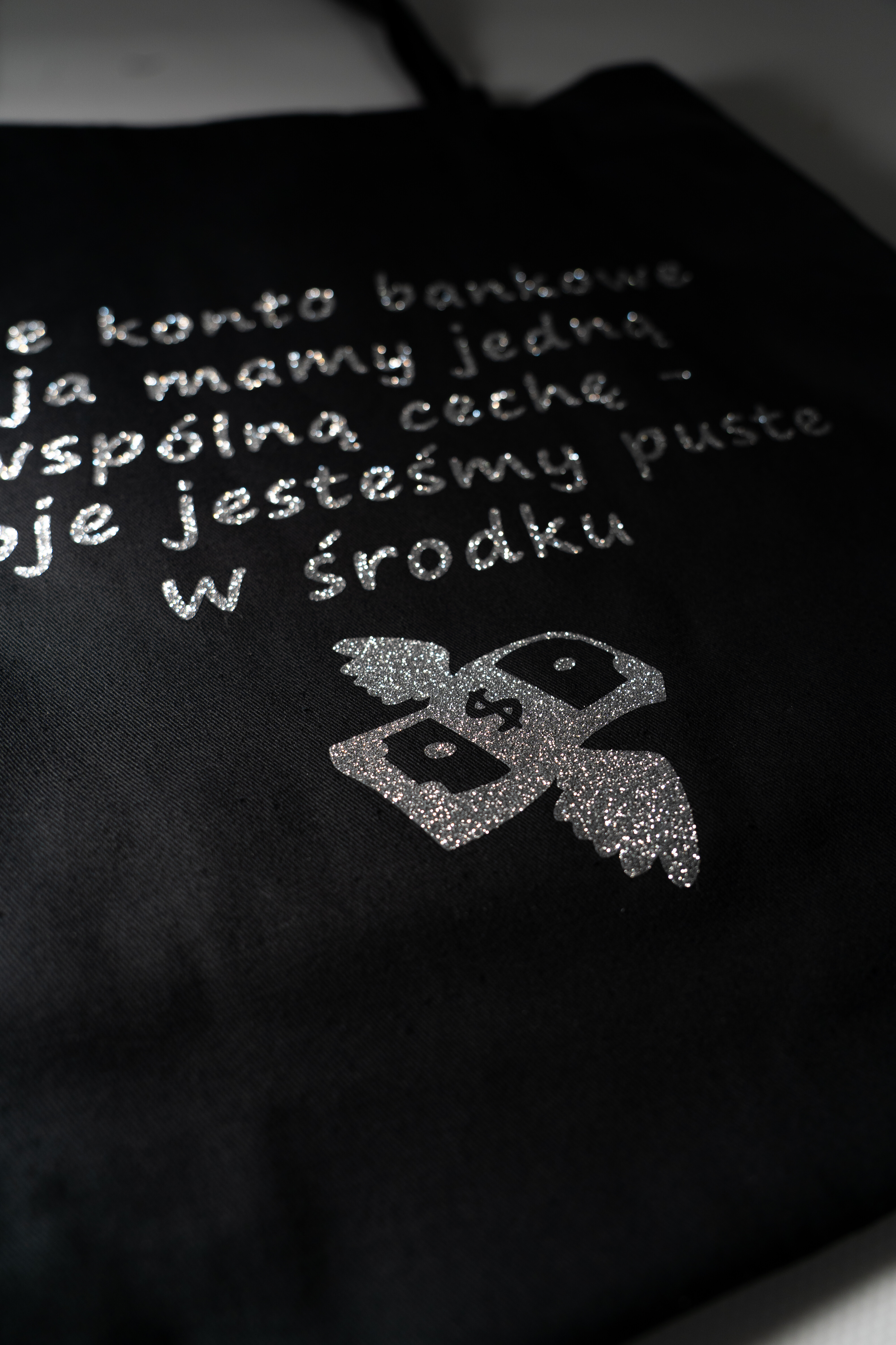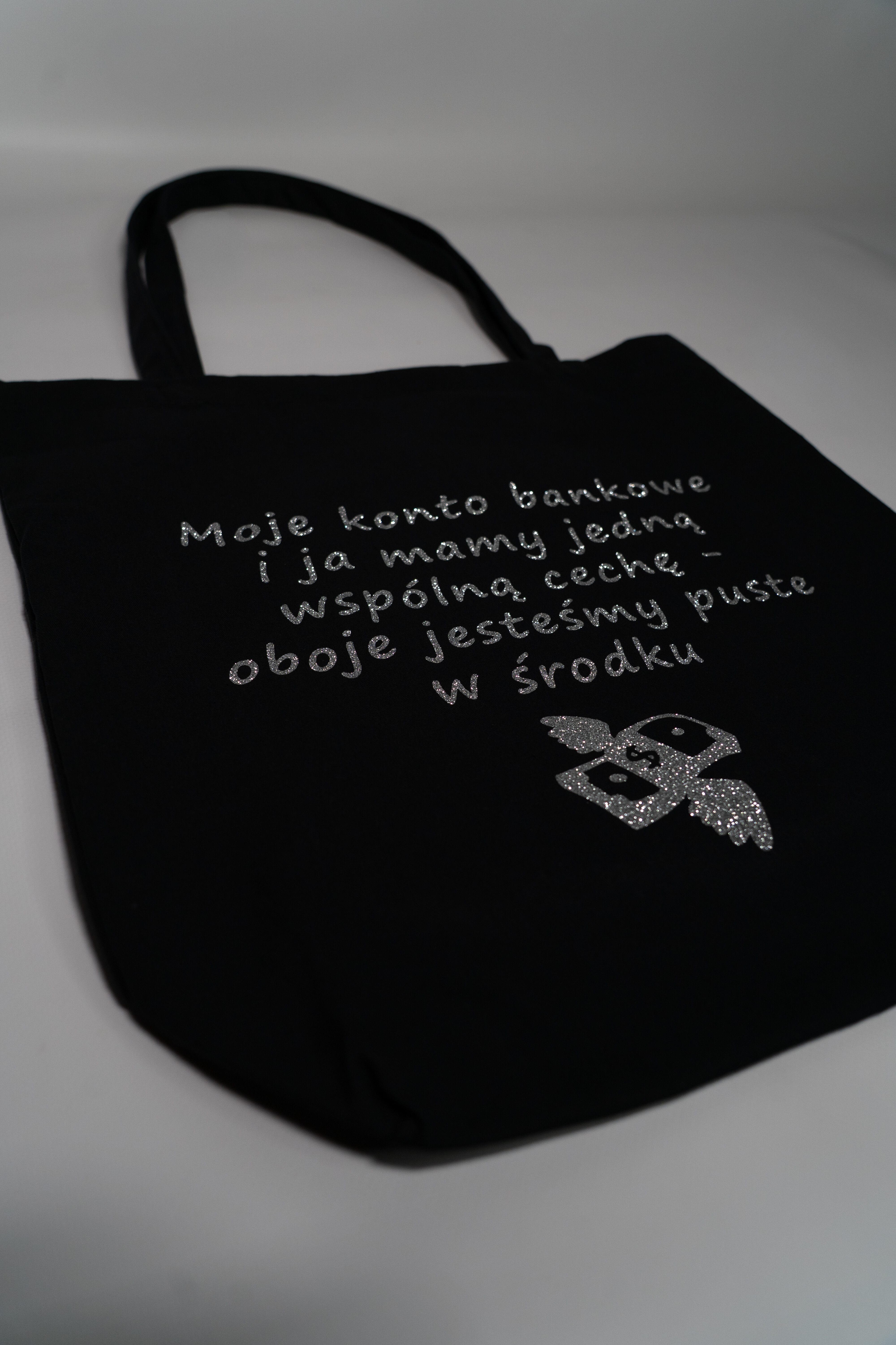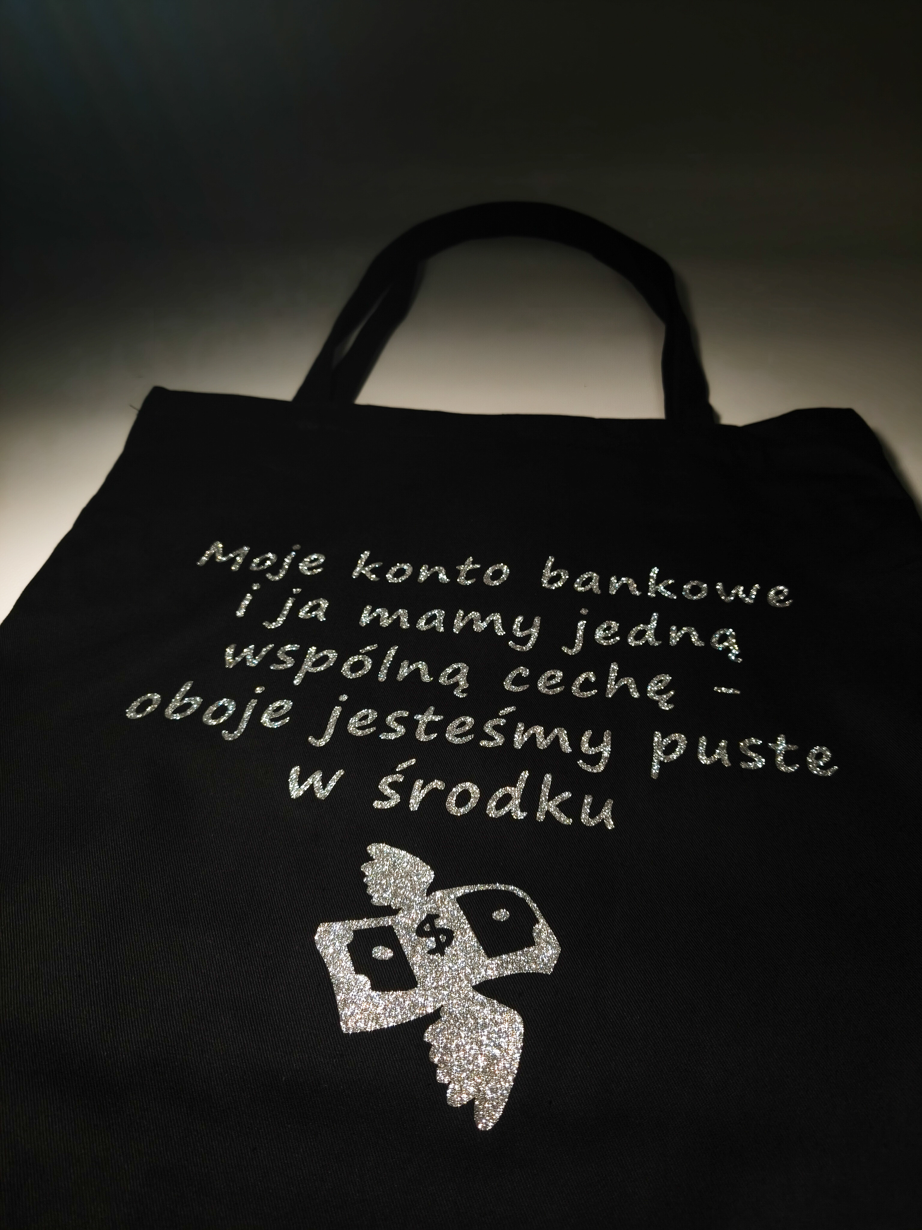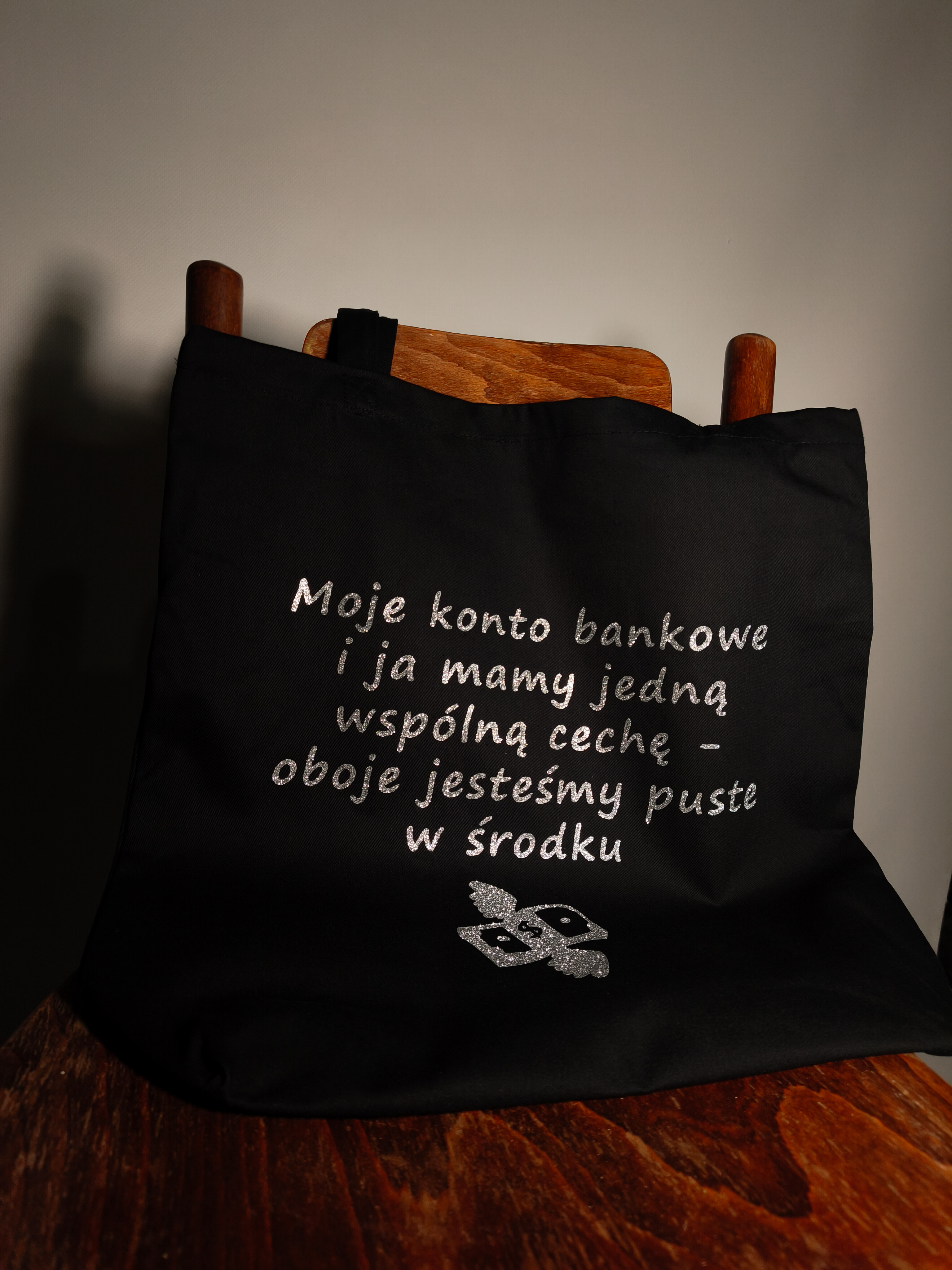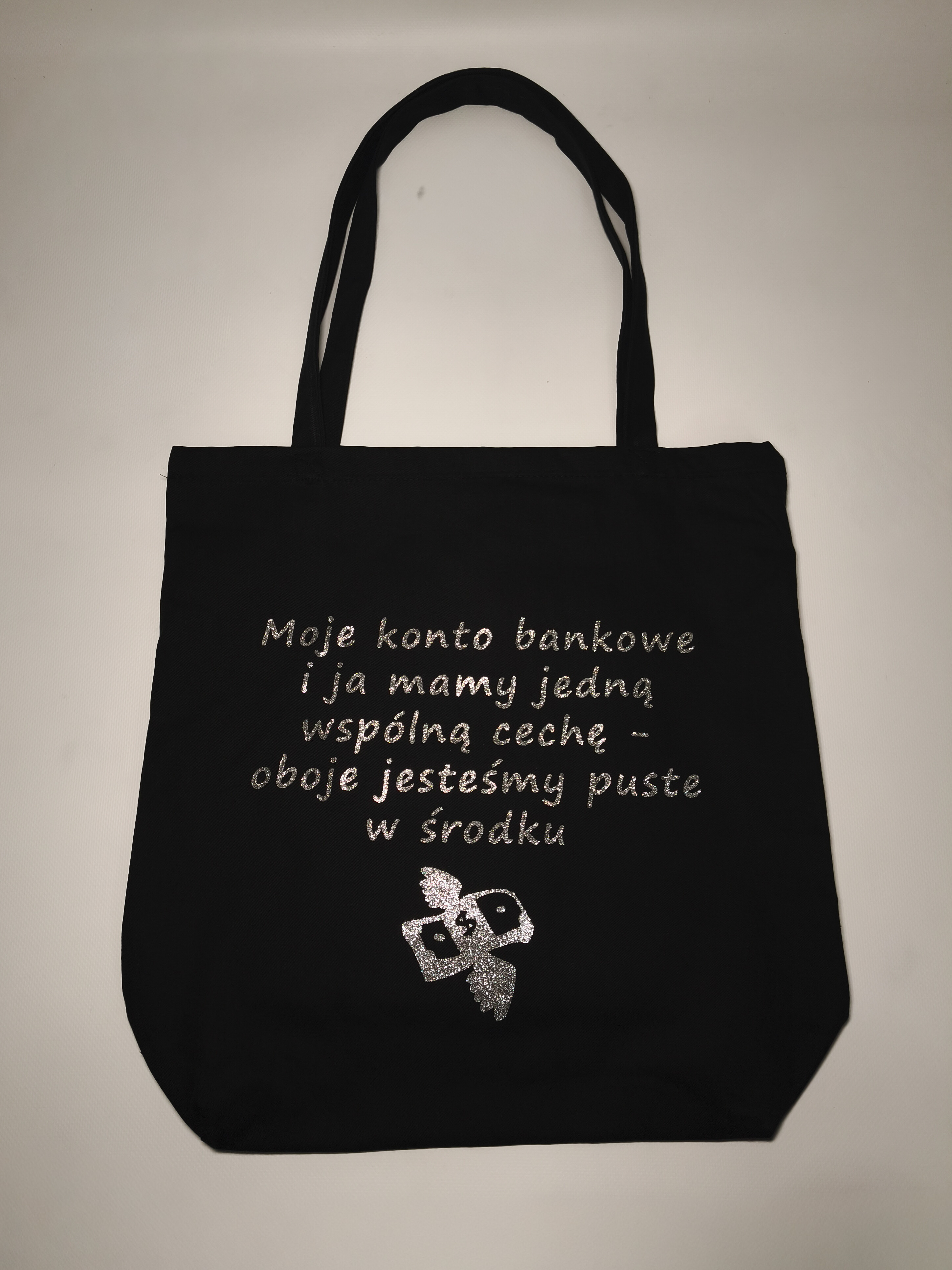 Torba bawełniana z nadrukiem – „Moje konto bankowe i ja mamy jedną wspólną cechę - oboje jesteśmy puste w środku.” Wykonana z grubej bawełny (280 g), pojemna torba z dnem i długim uchwytem. Wybierz kolor folii z jakiego wykonany jest napis i wzór.