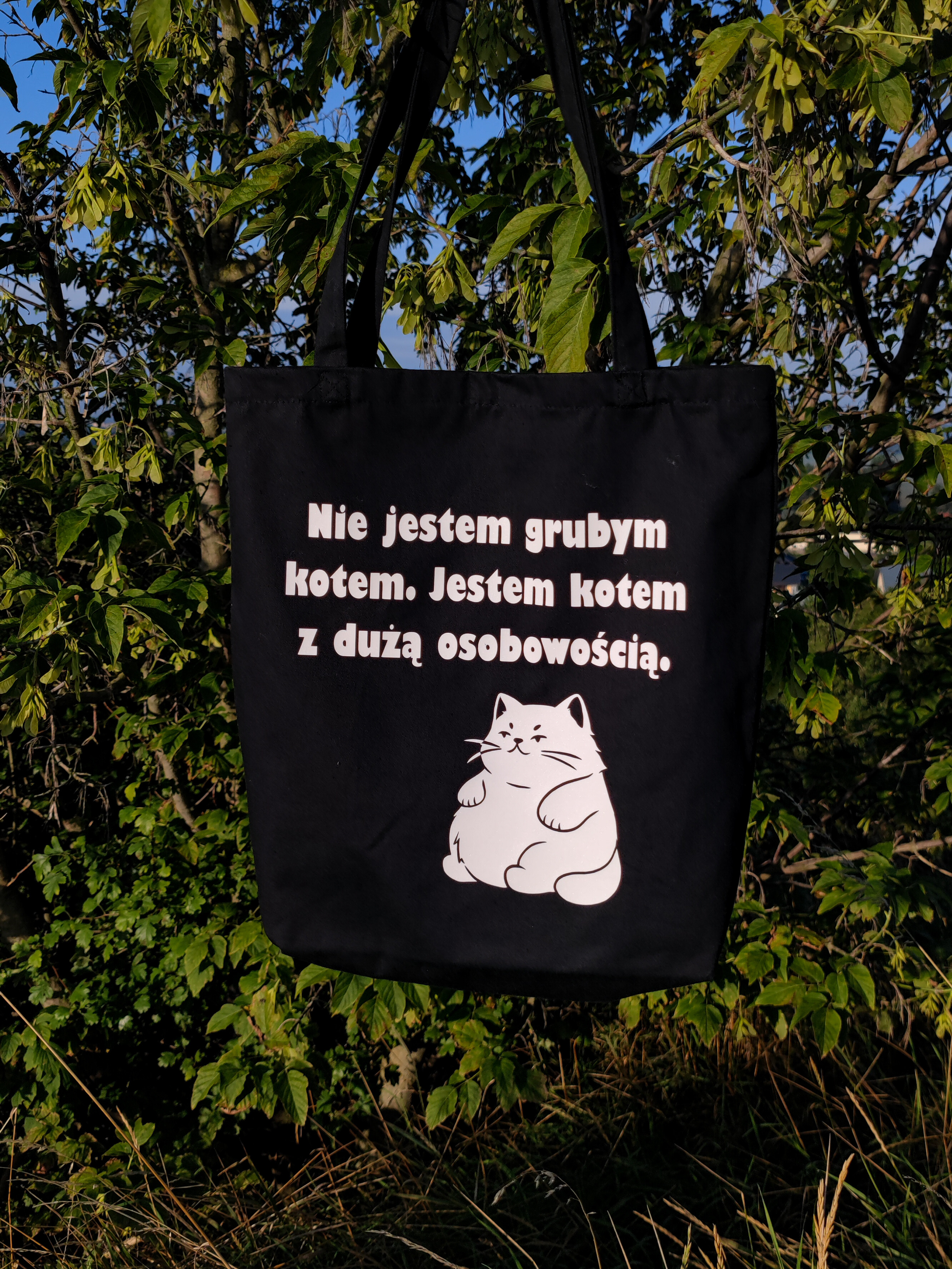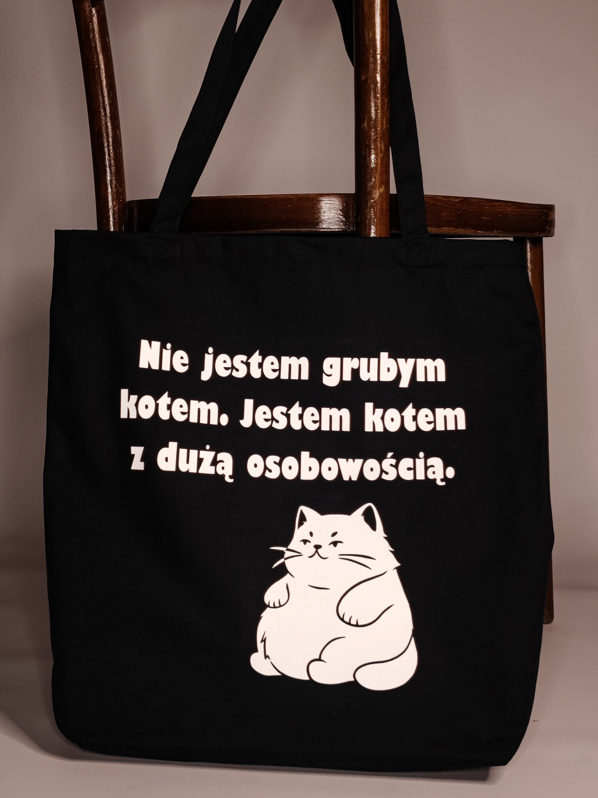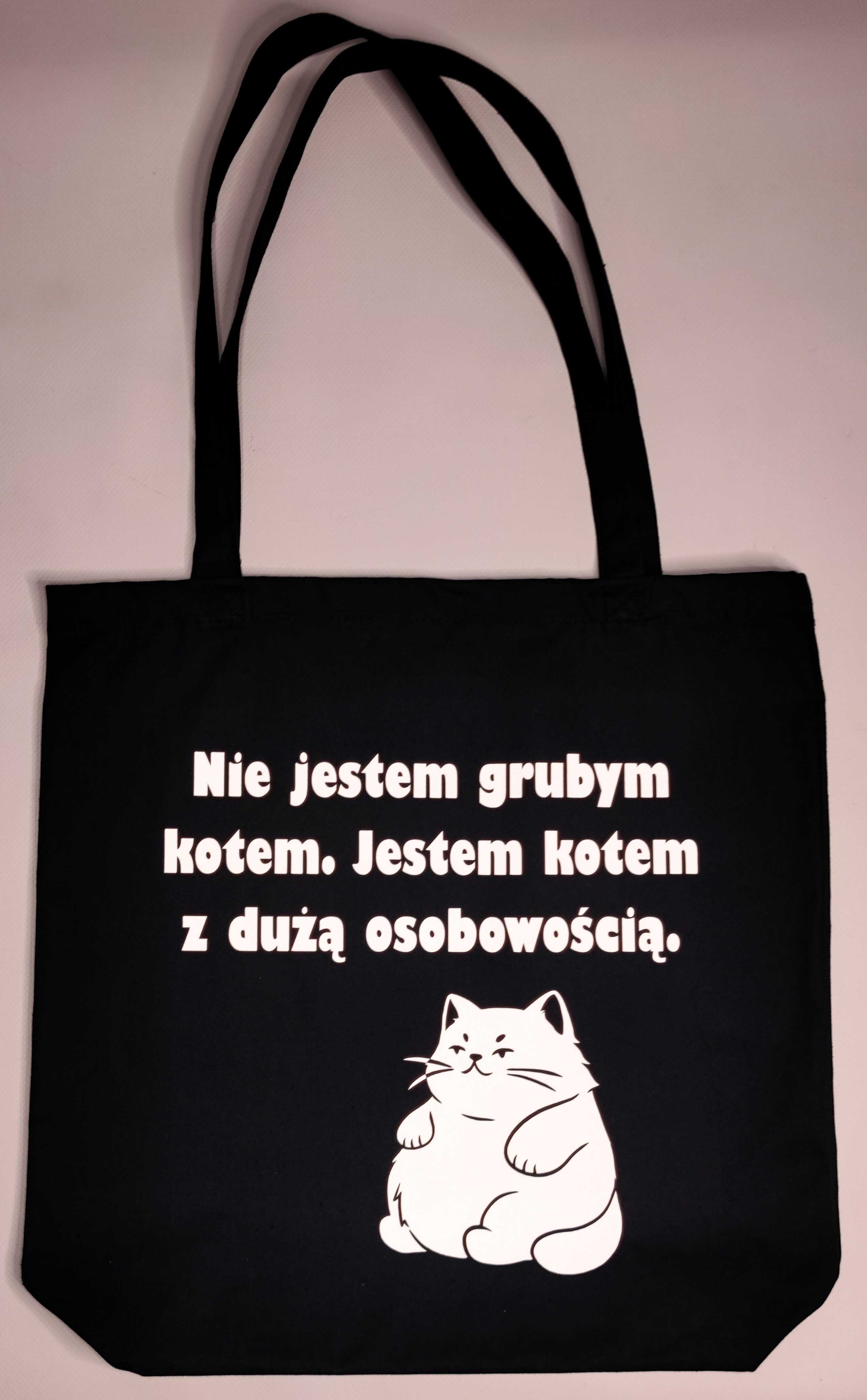 Torba bawełniana z nadrukiem - „Nie jestem grubym kotem. Jestem kotem z dużą osobowością.” Wykonana z grubej bawełny (280 g), pojemna torba z dnem i długim uchwytem. Wybierz kolor folii z jakiego wykonany jest napis i wzór.