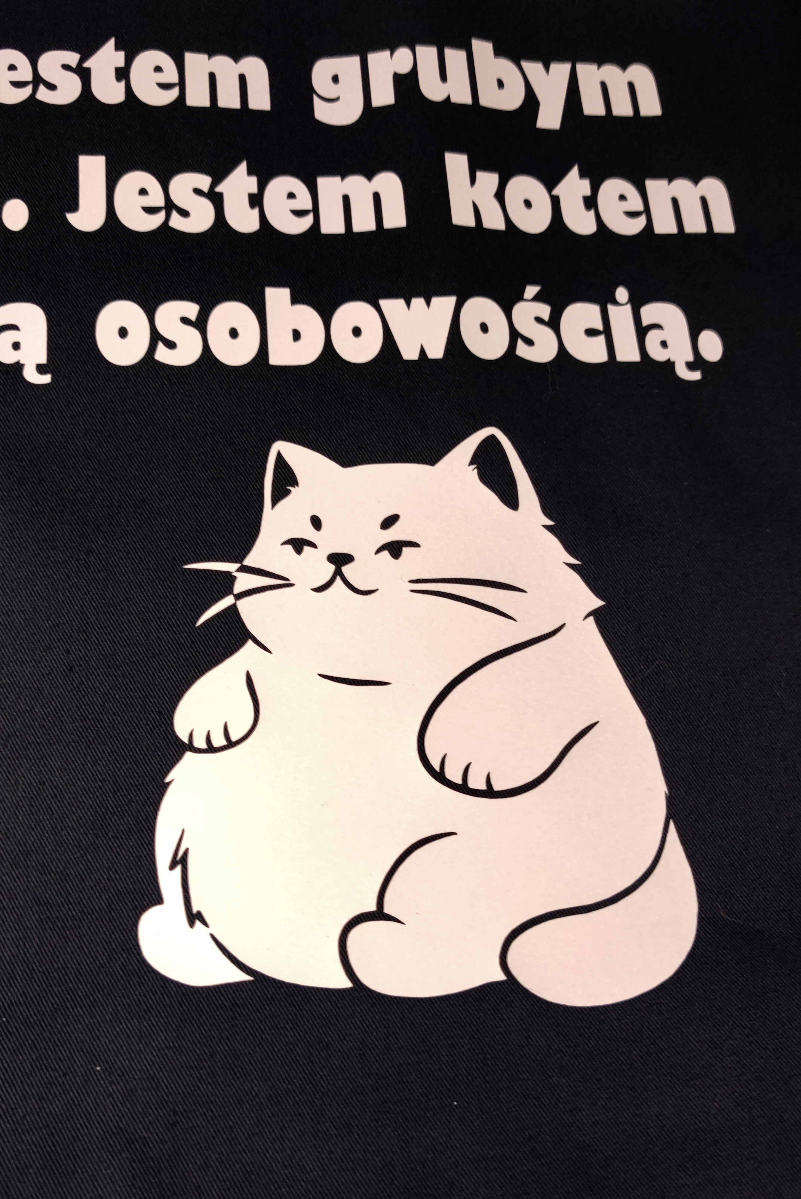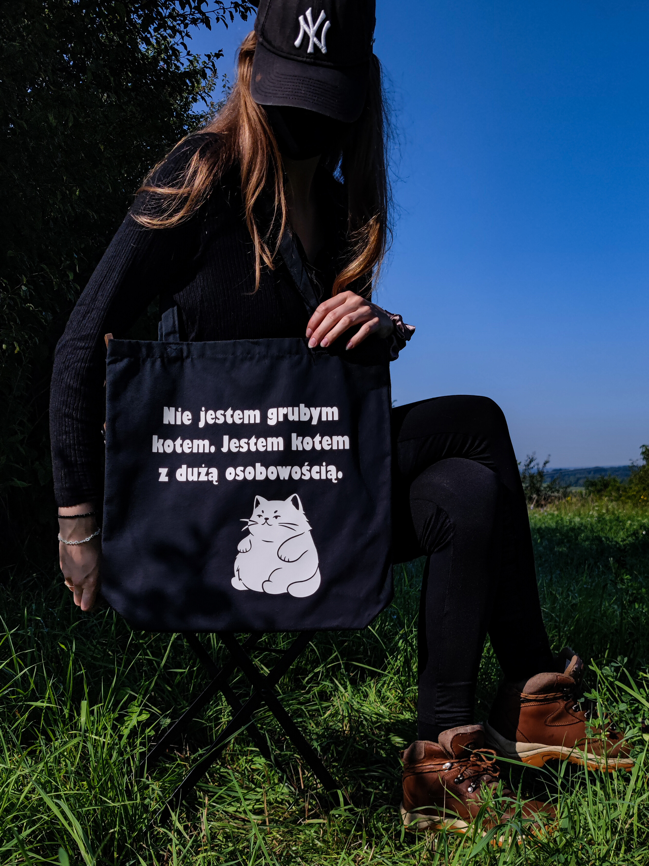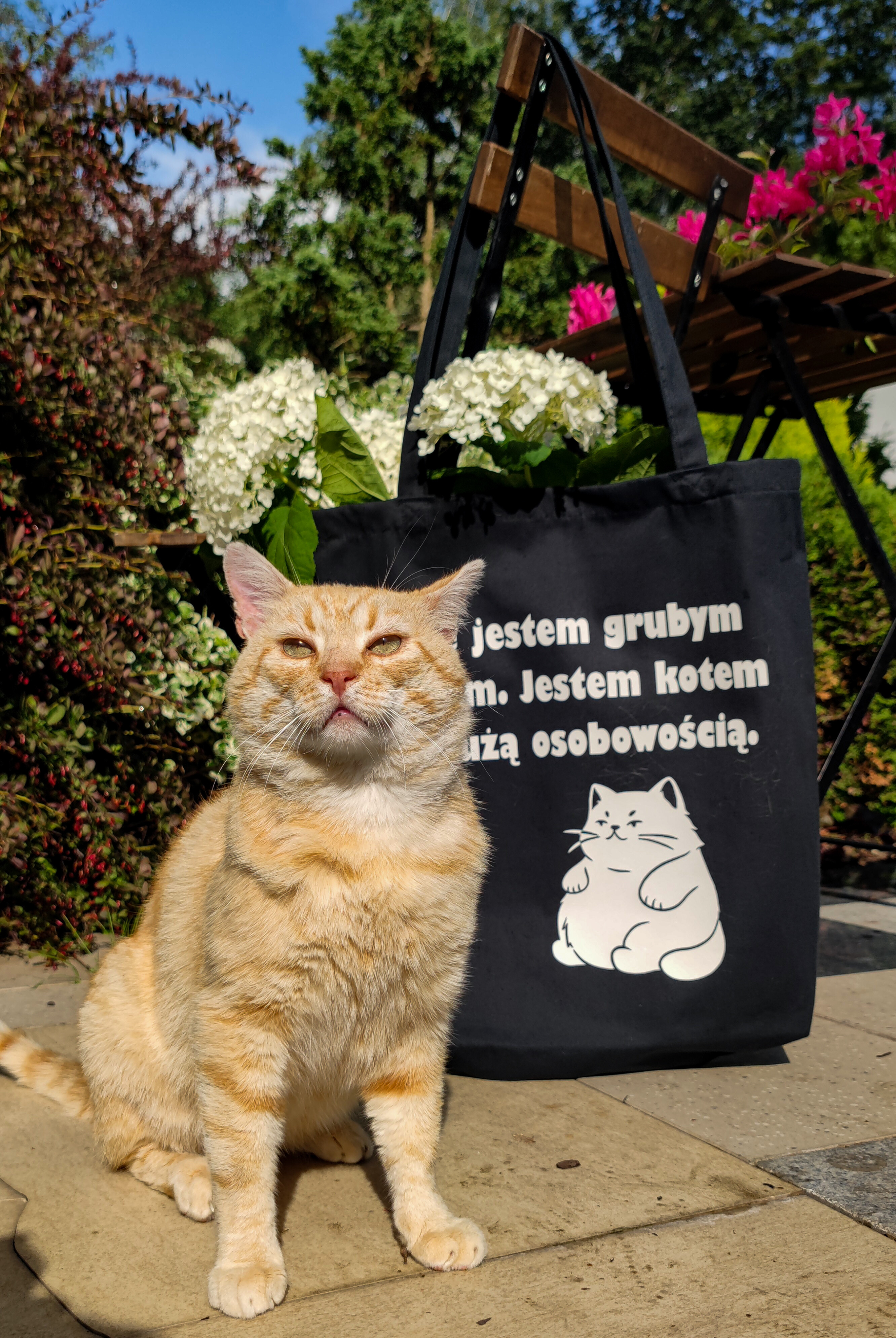 Torba bawełniana z nadrukiem - „Nie jestem grubym kotem. Jestem kotem z dużą osobowością.” Wykonana z grubej bawełny (280 g), pojemna torba z dnem i długim uchwytem. Wybierz kolor folii z jakiego wykonany jest napis i wzór.